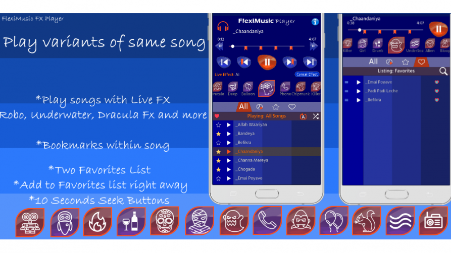 FlexiMusic FX Player is a Free Music Player app that can play your music with special effects like Robotic, Dracula, Underwater effects, etc. It can play Music like Special Sounds.