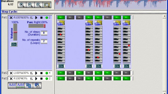You can include special effects to your patterns. You can adjust the number of repeats, volume and pan for a pattern. For a simple pattern, use step cycle.
